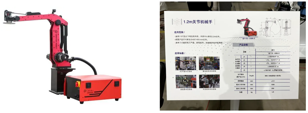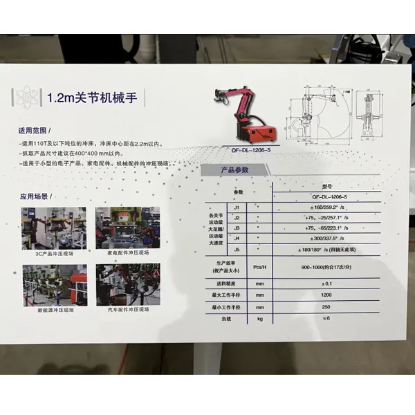 يبلغ طول الذراع 120 سم، ويصل الحمل إلى 6 كجم، باستخدام خوارزمية التحكم في الروبوت التي تم تطويرها بشكل مستقل لتحقيق التحكم في ربط المحاور المختلفة. واستهدافًا لخصائص التغذية لصناعة الختم، يتم إنشاء مسار الحركة تلقائيًا، مع إجراءات سلسة وفعالة وكفاءة 15 مرة/دقيقة.